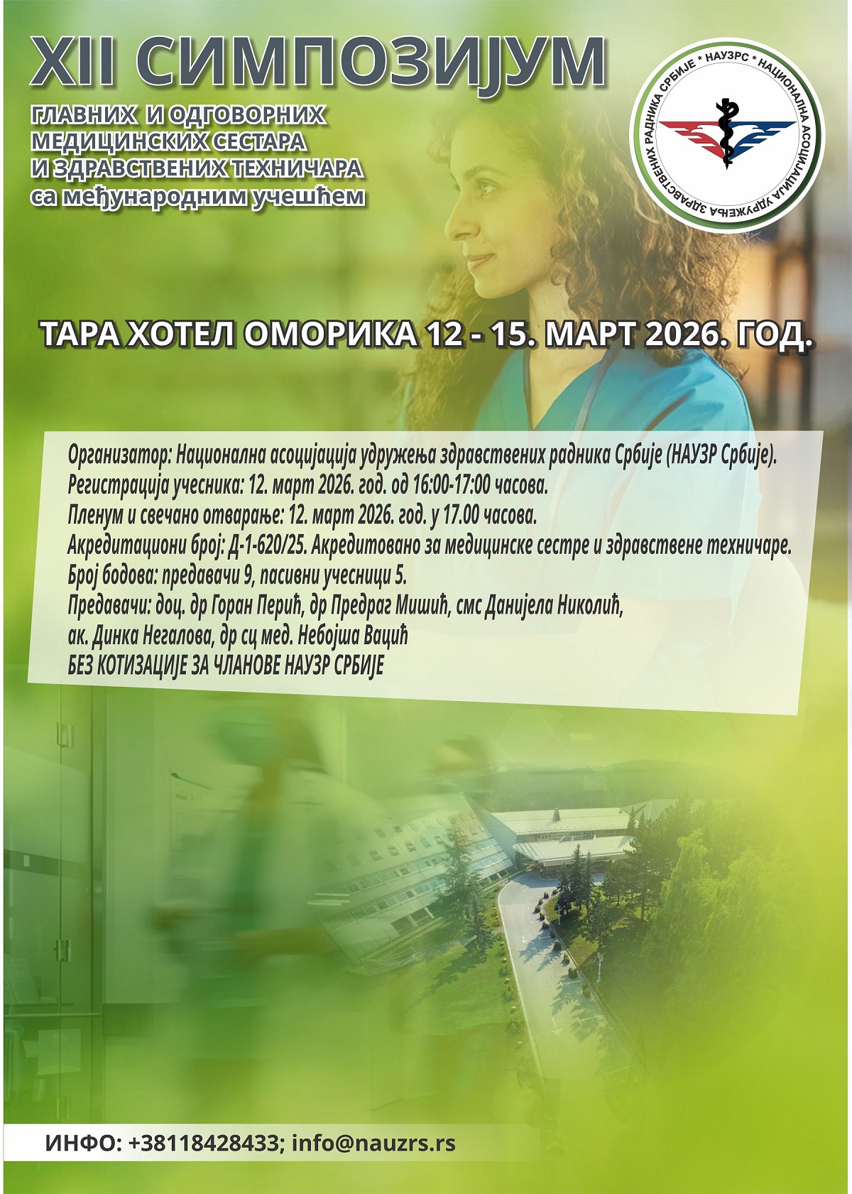 XII СИМПОЗИЈУМ ГЛАВНИХ И ОДГОВОРНИХ МЕДИЦИНСКИХ СЕСТАРА И ЗДРАВСТВЕНИХ ТЕХНИЧАРА НАУЗРС СА МЕЂУНАРОДНИМ УЧЕШЋЕМажурирано 17.12.2025.год. Добро дошли на XII симпозијум главних и одговорних медицинских сестара и здравствених техничара НАУЗРС са међународним учешћем који се одржава на Тари у Хотелу ”Оморика” од 12. до 15. марта 2026. године. Акредитациони број XII симпозијума главних и одговорних медицинских сестара и здравствених техничара НАУЗРС са међународним учешћем је: Д-1-620/25. Акредитован je за медицинске сестре и здравствене техничаре. ______________________________________________________________________________________