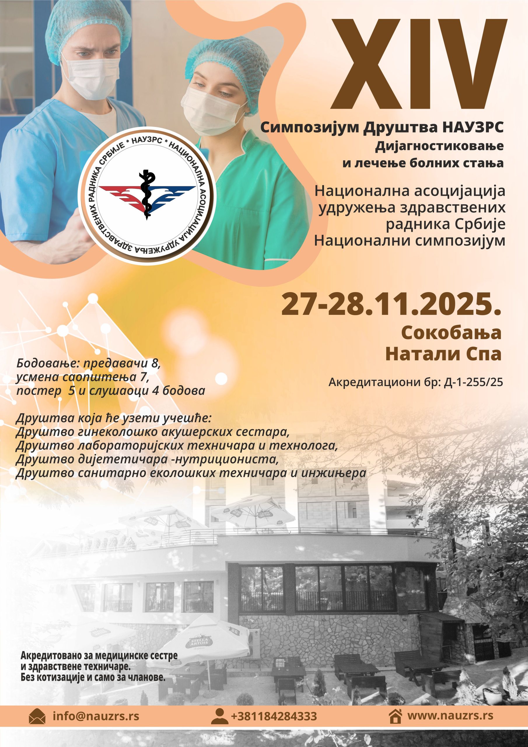 XI СИМПОЗИЈУМ ГЛАВНИХ И ОДГОВОРНИХ МЕДИЦИНСКИХ СЕСТАРА И ЗДРАВСТВЕНИХ ТЕХНИЧАРА НАУЗРС СА МЕЂУНАРОДНИМ УЧЕШЋЕМ „ПСИХОСОМАТСКЕ БОЛЕСТИ“ажурирано 25.12.2024.год. Добро дошли на XI симпозијум главних и одговорних медицинских сестара и здравствених техничара НАУЗРС са међународним учешћем који се одржава у Врњачкој Бањи у Хотелу ”Фонтана” од 13. до 16. марта 2025. године. Акредитациони број XI симпозијума главних и одговорних медицинских сестара и здравствених техничара НАУЗРС са међународним учешћем је: Д-1-609/24. Акредитован je за медицинске сестре и здравствене техничаре. ______________________________________________________________________________________