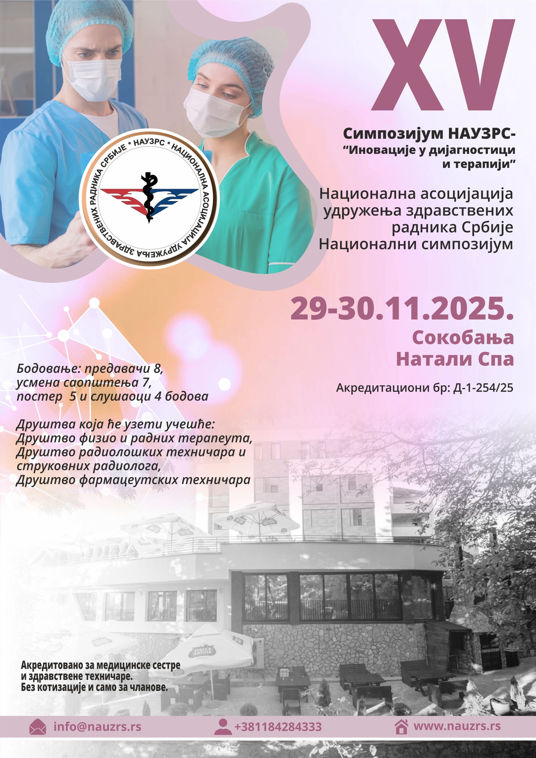 ПРОГРАМ XV СИМПОЗИЈУМА ДРУШТАВА НАУЗРС – Иновације у дијагностици и терапији (Сокобања – новембар 2025)ажурирано 06.11.2025.год. Добро дошли на XV Симпозијум Друштава НАУЗРС „Иновације у дијагностици и терапији„ који се одржава у Соко бањи у Хотелу ”Натали Спа” од 29. до 30. новембра 2025. године. ______________________________________________________________________________________
