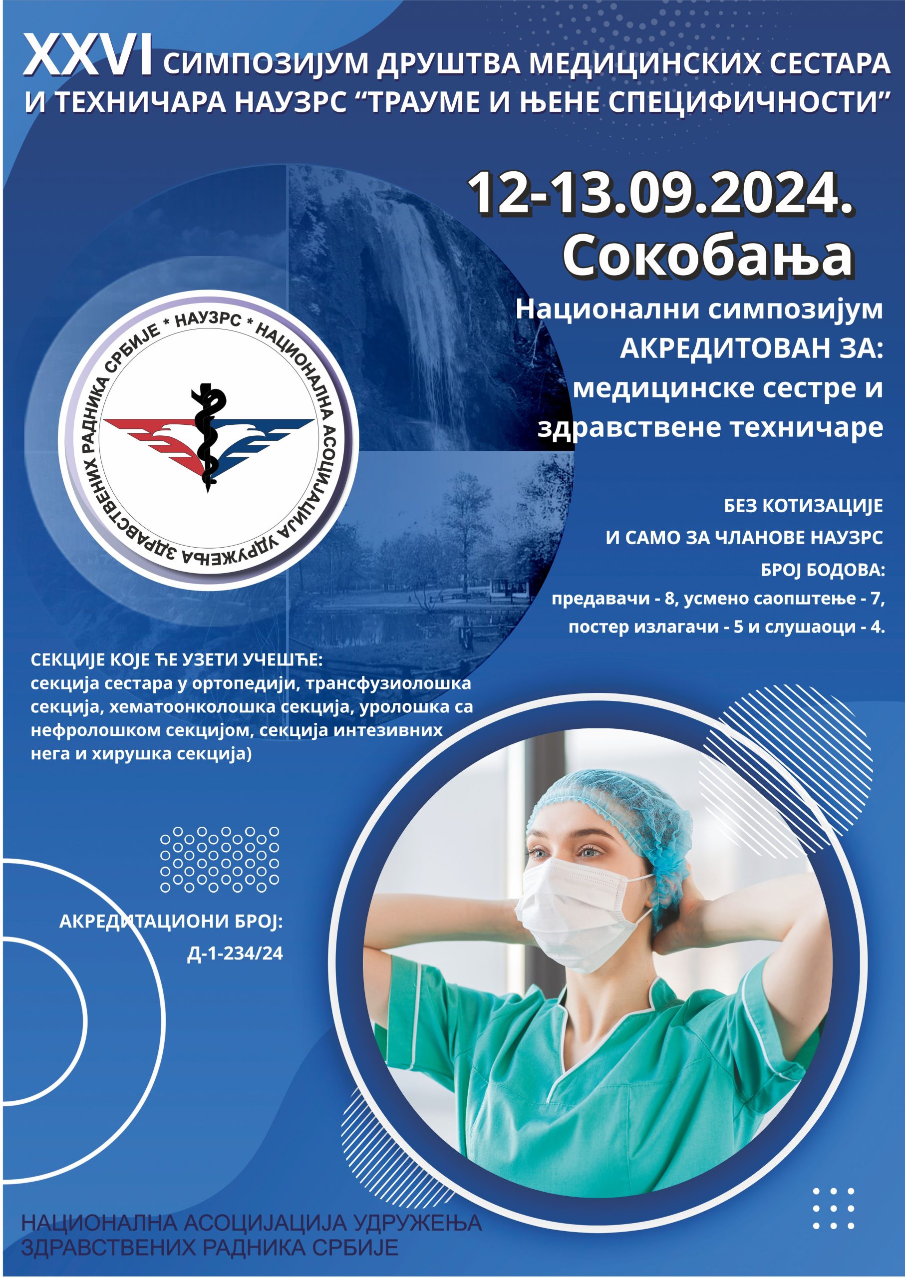 XXVI СИМПОЗИЈУМ ДРУШТВА МЕДИЦИНСКИХ СЕСТАРА И ТЕХНИЧАРА НАУЗРС „ТРАУМЕ И ЊЕНЕ СПЕЦИФИЧНОСТИ“ СОКОБАЊА СЕПТЕМБАР 2024.ажурирано 13.06.2024.год. Добро дошли на XXVI симпозијум Друштва медицинских сестара и техничара НАУЗР Србије у Хотелу ”Натали Спа” Сокобања у периоду од 12. до 13. септембра 2024. године. ______________________________________________________________________________________