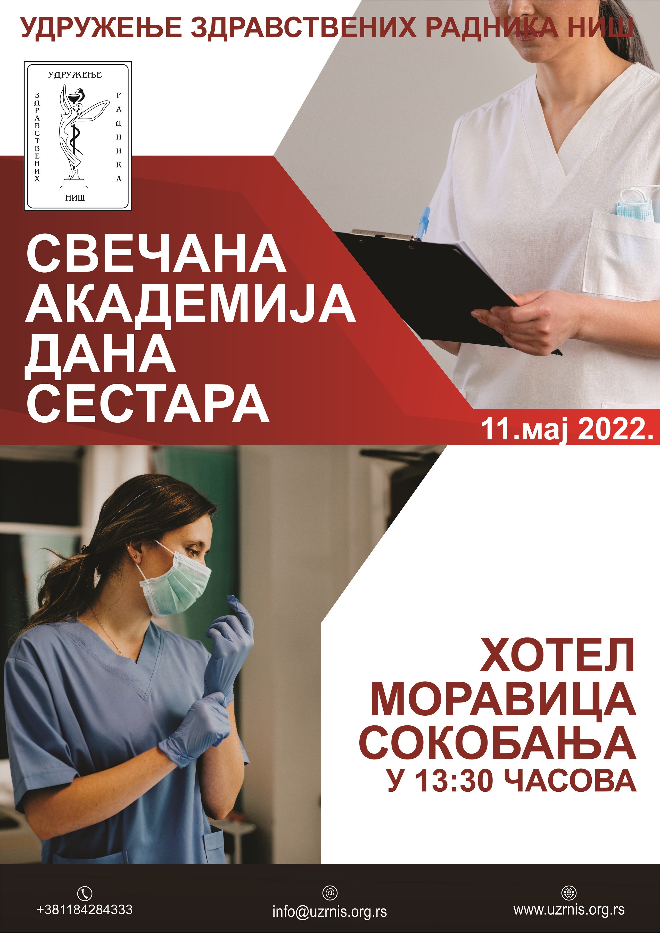 Свечана Акдемија дана сестараажурирано 21.04.2022.год. Свечана Академија поводом обележавања 12. маја Међународног дана медицинских сестара - техничара и бабица, одржаће се 11. маја 2022. године у Хотелу Моравица Сокобања у 13.30. часова. Организатор свечане академије је Удружење здравствених радника. ______________________________________________________________________________________