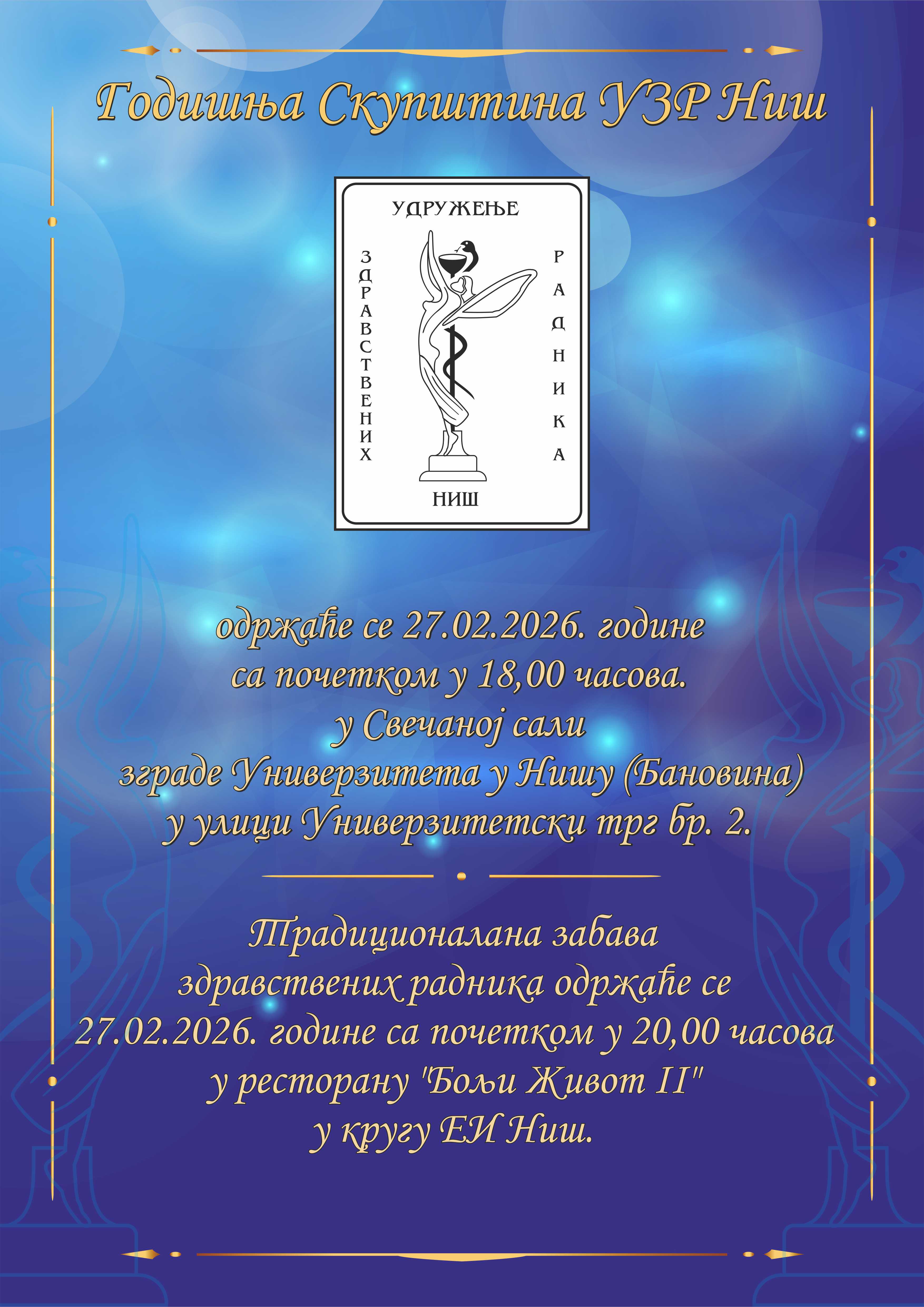 Годишња Скуштина и традиционална забава здравствених радника УЗР Нишажурирано 15.01.2024.год. Годишња Скуштина УЗР Ниш одржаће се 23.02.2024. године са почетком у 18,00 часова. Одржаће се у Свечаној сали зграде Универзитета у Нишу (Бановина). После Годишње Скупштине одржаће се Традиционалана забава здравствених радника са почетком у 20,00 часова у ресторану "Бољи Живот II" у кругу ЕИ Ниш. Добродошли! ______________________________________________________________________________________