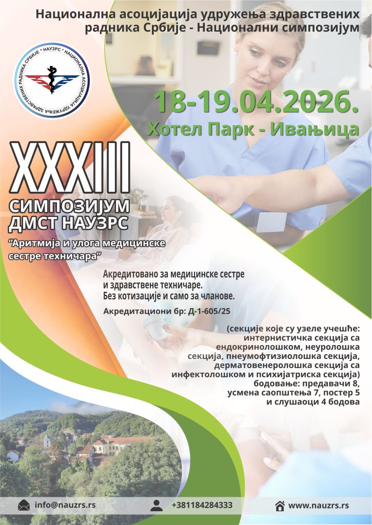 Позивамо вас да учествујете на предстојећим националним симпозијумима у организацији Националне асоцијације удружења здравствених радника Србије, који ће се одржати у Хотелу Парк – Ивањица у периоду од 16. до 19. априла 2026. године. XXXII Симпозијум НАУЗРС – Тема: Увођење нових здравствених технологија и процедура. Симпозијуми су бодовани према важећој табели за националне скупове:
